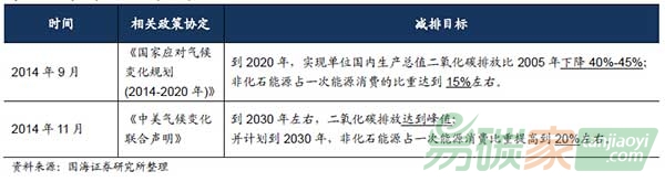 目前,我國(guó)已成為全球二氧化碳排放第一大國(guó),2014 年,我國(guó)二氧化碳排放量約為97.61億噸,而非化石能源占一次能源消費(fèi)比重提預(yù)計(jì)僅為11.1%左右,在全球溫室效應(yīng)及氣候變暖的大背景下,我國(guó)面臨一定的國(guó)際社會(huì)壓力,早在2009 年,前國(guó)務(wù)院總理溫家寶在哥本哈根會(huì)議上已提出到2020的縮減碳排放目標(biāo),而此目標(biāo)在2014年國(guó)務(wù)院正式印發(fā)的《國(guó)家應(yīng)對(duì)氣候變化規(guī)劃(2014-2020 年)》再次得以確認(rèn)。2014年11月,中國(guó)與美國(guó)發(fā)布《中美氣候變化聯(lián)合聲明》,進(jìn)一步明確至2030年的長(zhǎng)期減排目標(biāo)。在縮減碳排、提高非化石能源利用上,我國(guó)具國(guó)際責(zé)任及內(nèi)外政策約束。
