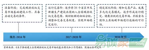 具體到建立全國(guó)碳排放交易市場(chǎng)的時(shí)間節(jié)點(diǎn),發(fā)改委氣候變化司官員曾在多個(gè)公開場(chǎng)合表示,將爭(zhēng)取在2016 開始運(yùn)行全國(guó)碳排放權(quán)交易市場(chǎng)。而2015 年1 月,國(guó)家發(fā)改委氣候司在中國(guó)經(jīng)貿(mào)導(dǎo)刊上發(fā)表文章《關(guān)于推動(dòng)建立全國(guó)碳排放權(quán)交易市場(chǎng)的基本情況和工作思路》,闡述了碳排放交易市場(chǎng)建立的中長(zhǎng)期規(guī)劃。