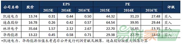 其次,在光伏領(lǐng)域我們建議關(guān)注林洋電子,公司在手權(quán)益裝機(jī)149MW,牽手華為規(guī)劃打造GW 級(jí)光伏電站,預(yù)計(jì)2015-2017 每年新增裝機(jī)500MW 左右,年新增裝機(jī)對(duì)應(yīng)CCER 收入約1000-1400 萬(wàn)元。