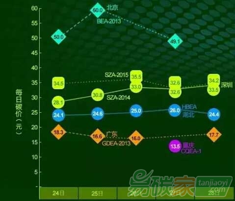 北京本周碳價(jià)大幅上漲,周二收于60.00元/噸,較上周漲幅高達(dá)42.9%;成交量繼續(xù)下降,為23噸,成交額為1,142.00元;