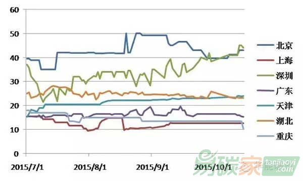 從2014年履約期后(2015年7月1日)走勢看,深圳市場波動上漲,其余市場在原有價格基礎(chǔ)上小幅波動。但從盤面看,個別市場價格并無成交量支撐,因此存在一定水分;湖北、廣東等市場參與者對當(dāng)前價格水平認可程度較高。