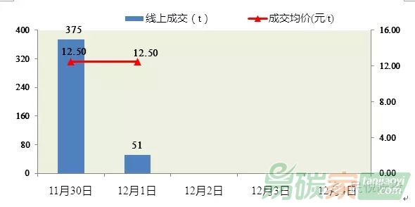 上周重慶碳市11月30日、12月1日均有成交。成交量分別為375噸,51噸。成交均價(jià)均為12.50元。