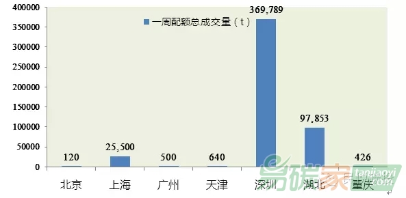 上周7試點(diǎn)配額交易總成交量為494,828噸。其中深圳碳交易市場(chǎng)持續(xù)活躍,配額成交量全國最高,上周總成交量達(dá)369,789噸。