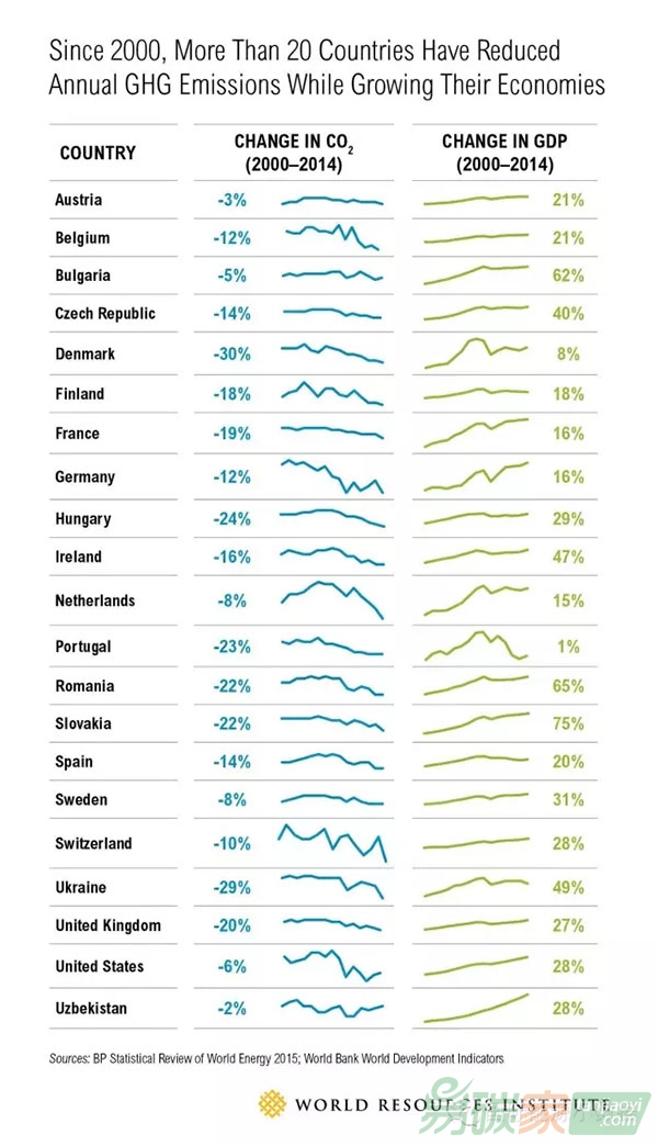 這21個國家中有些是前蘇聯(lián)東歐國家正處于經(jīng)濟轉(zhuǎn)型期,不具代表性。但值得一提的首先是美國,這個世界最大的經(jīng)濟體從2000年到2014年GDP總量增長幅度為28%,但二氧化碳排放量下降了6%。英國的表現(xiàn)更是搶眼,2000年到2014年GDP增幅27%,但碳排放總量下降達20%。