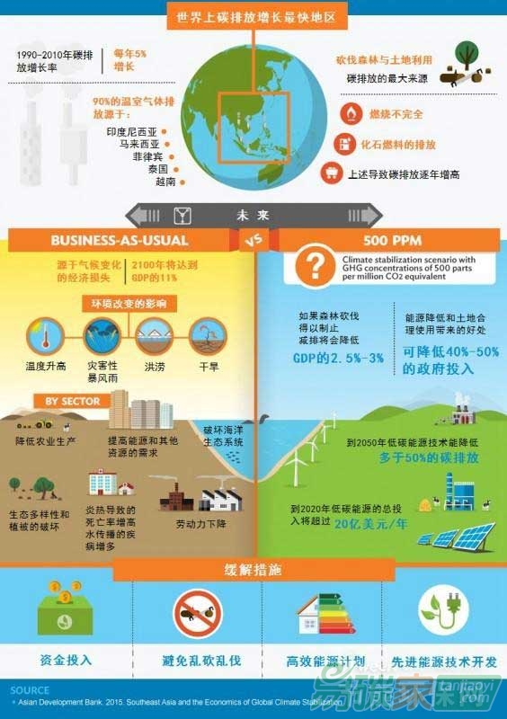 據(jù)亞洲銀行數(shù)據(jù)統(tǒng)計(jì),從1990年到2010年,東南亞的二氧化碳排放量快速增長(zhǎng),增長(zhǎng)率明顯高于全球其他地區(qū)。這一變化可能源于其快速的經(jīng)濟(jì)增長(zhǎng)。溫室氣體增高導(dǎo)致諸多環(huán)境問題,從而惡性循環(huán)再次影響經(jīng)濟(jì)發(fā)展。預(yù)計(jì)到2100年,因全球氣候變化造成的經(jīng)濟(jì)損失將達(dá)到GDP的11%。