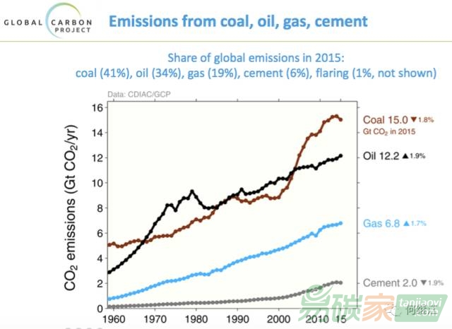 煤炭造成的碳排放150億噸,比去年下降1.8%。油和氣分列為12.2和6.8%,都比去年略有上升。