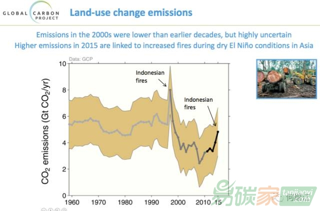 土地利用造成的碳排放。土地利用的碳排放總體來說核算沒有化石能源的碳排放那么準(zhǔn)確,不確定性也高。2000年以來,總體是減少的。但印度尼西亞的森林一著大火,碳排放就會急劇增高。