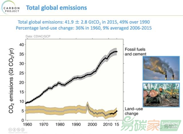 碳排放總量約為36.3GtC ,也即363億噸(1GtC為10億噸碳),與2014年持平。