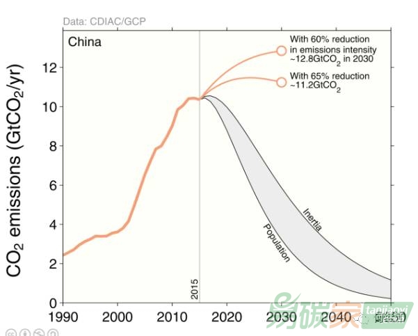 碳強度降低60%,那2030年達峰時的排放大約是128億噸,如果碳強度降低65%,那2030年達峰時的排放大約是112億噸.