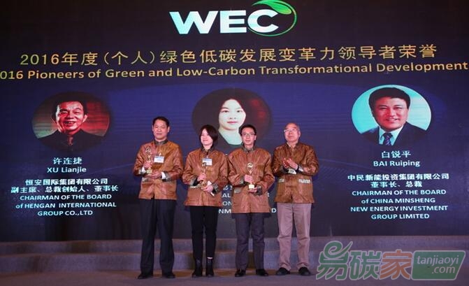 2016年度國(guó)際碳金獎(jiǎng)“綠色低碳變革者”最終由恒安國(guó)際集團(tuán)有限公司董事局副主席兼總裁許連捷、中民新能投資集團(tuán)有限公司董事長(zhǎng)兼總裁白銳平、同方環(huán)境股份有限公司總經(jīng)理湯樂(lè)萍三人獲得;北京新能源汽車股份有限公司和恒安國(guó)際集團(tuán)有限公司、同方環(huán)境股份有限公司還共同獲得了2016年度國(guó)際碳金總獎(jiǎng);遠(yuǎn)大住宅工業(yè)集團(tuán)股份有限公司、中國(guó)平安保險(xiǎn)(集團(tuán))股份有限公司、中化藍(lán)天集團(tuán)有限公司、廣東省湛江市人民政府獲得2016年度國(guó)際碳金獎(jiǎng)“WEC生態(tài)實(shí)踐”獎(jiǎng)的榮譽(yù)單位;廣州立白企業(yè)集團(tuán)有限公司、中國(guó)