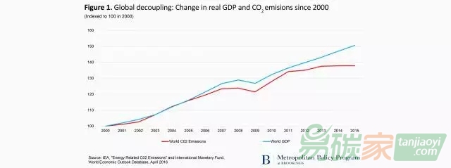 下面兩張圖引自美國(guó)布魯金斯學(xué)會(huì)于2016年12月發(fā)布的一份報(bào)告[2]。圖1顯示是2000-2015年全球?qū)嶋HGDP增長(zhǎng)與碳排放增長(zhǎng)的關(guān)系。2000-2005年,二者緊密相關(guān);2006-2009年,緊密度降低,但二者較高的相關(guān)性直到2013年出現(xiàn)顯著變化,2014和2015兩年,全球GDP依然保持顯著增長(zhǎng),而碳排放卻基本沒有增加。相比之下,美國(guó)的情形相當(dāng)不同,實(shí)際GDP增長(zhǎng)與碳排放在過去15年出現(xiàn)了明顯的“脫鉤”,除了2007-2009年的短暫經(jīng)濟(jì)衰退,實(shí)際GDP保持在一個(gè)持續(xù)增長(zhǎng)的路徑上;2000-2007年的碳排放增長(zhǎng)緩慢,已顯露與GDP增長(zhǎng)脫鉤的趨勢(shì),2007年之后,這一趨勢(shì)更加明顯,因?yàn)檫@一期間,實(shí)際GDP增長(zhǎng)持續(xù),但碳排放在局部年份上升的情形下保持了下降的總態(tài)勢(shì)。