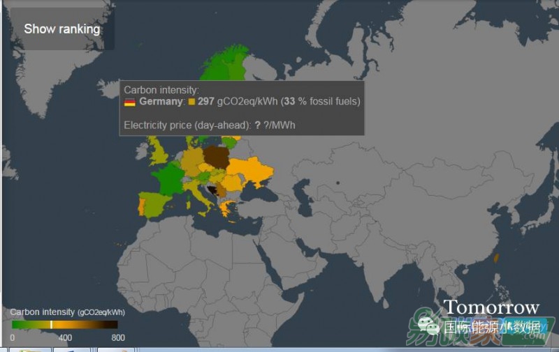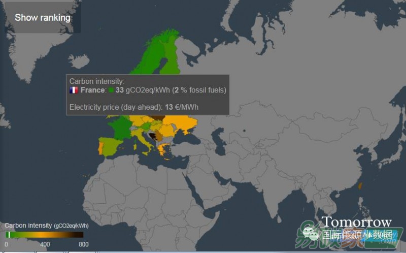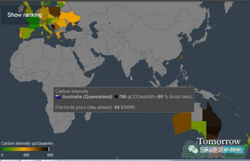 Electricitymap制作電力碳排放地圖,實時顯示北美、歐洲、澳洲各國的度電碳排放(克二氧化碳/千瓦時)。