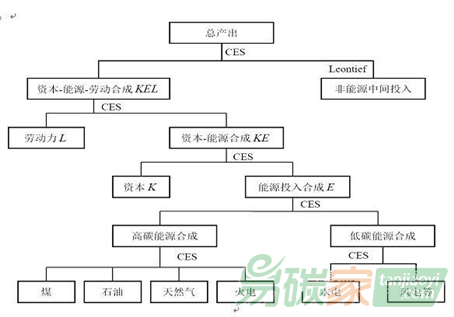 石化 能源(石化能源進(jìn)一步細(xì)分為煤炭、石油和天然氣),采用多層CES函數(shù)嵌套方式進(jìn)行組合,并從碳稅征收方式和碳稅使用方式上綜合模擬分析碳稅及相關(guān)二氧化碳減排問題。