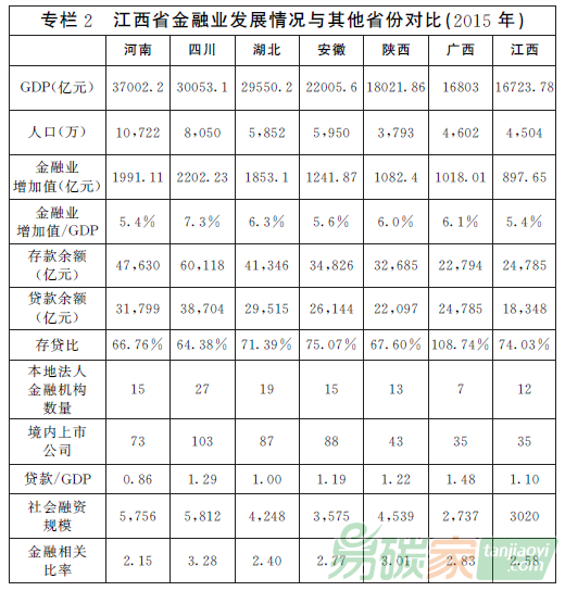 同時,江西金融發(fā)展還存在一些不足,突出表現(xiàn)在:一是金融總量整體偏小。2015年末,各項存款余額(25042.97億元)與GDP(16723.8億元)比例為1.5∶1,各項貸款余額(1856109億元)與GDP比例為1.1∶1,金融相關比率(FIR)為2.58,金融業(yè)增加值占GDP比重為5.4%,與發(fā)達省市差距較大。全省社會融資規(guī)模增量(3019.71億元)僅占全國1.96%,35家境內上市公司總市值(4129億元)占GDP比重(證券化率)不到25%,遠低于78.26%的全國水平。二是金融機構集聚效應不明顯。金融資產總量不大,傳統(tǒng)存貸業(yè)務仍然占主導地位,創(chuàng)新金融工具偏少,同質化經營嚴重,缺乏特色和規(guī)模效應,地方金融機構小、弱、散