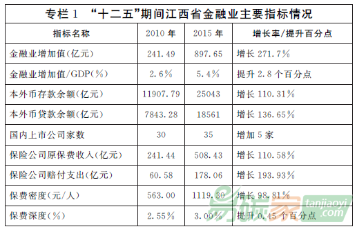 ——金融支持經濟發(fā)展更加有力?!笆濉蹦?,金融業(yè)對經濟增長貢獻率達到7.1%,比“十一五”末提高5.4個百分點。2015年,全省銀行、證券、保險(僅指產險)機構分別實現(xiàn)凈利潤3433億元、37.73億元和9.41億元。金融業(yè)實現(xiàn)稅收188.89億元,占全省稅收總額的7.96%。社會融資規(guī)模增量達3019.71億元,比2010年增加366.91億元。全省境內外上市公司54家(境內35家,境外19家),在“新三板”掛牌企業(yè)62家,“險資入贛”累計到位資金174.3億元。