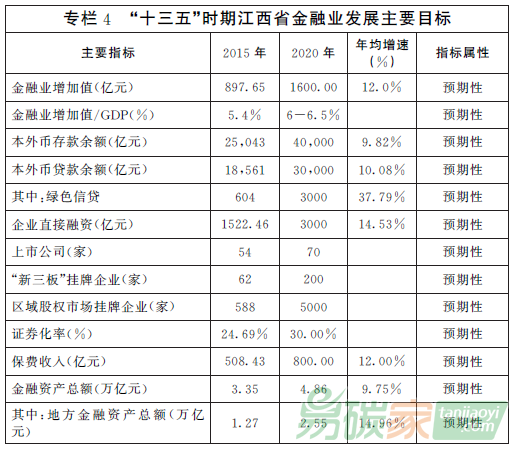 ——金融業(yè)總量發(fā)展目標?!笆濉逼陂g,全省金融業(yè)增加值年均增長12%左右,到2020年,金融業(yè)增加值達到1600億元左右,占地區(qū)生產總值的比重達到6-65%。企業(yè)直接融資規(guī)模突破3000億元。