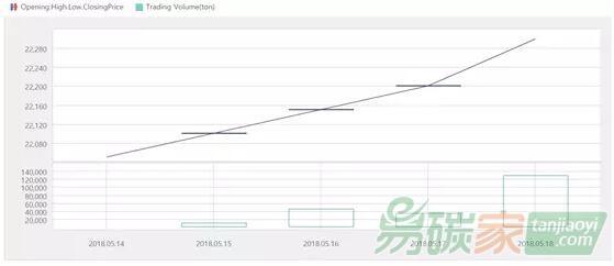 2018年5月14日至2018年5月20日,韓國碳市場(chǎng)價(jià)格在22050-22300韓元/噸(約20.37-20.60美元/噸)之間波動(dòng)。