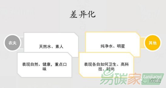 市面上的瓶裝飲用水分為礦泉水與純凈水,主要區(qū)別是水的原材料不同:一種原料是天然的礦泉水(農(nóng)夫山泉),另一種原料是天然水/自來(lái)水深度處理(怡寶)。目前這幾家國(guó)內(nèi)品牌飲用水企業(yè)的廣告策略與營(yíng)銷(xiāo)(差異化)主要體現(xiàn)在產(chǎn)品的水質(zhì)、健康、科技、包裝設(shè)計(jì)等噱頭上。