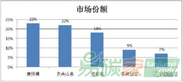 差異化戰(zhàn)略——瓶裝水產(chǎn)品碳標(biāo)簽“入場(chǎng)” 中國(guó)產(chǎn)業(yè)研究報(bào)告網(wǎng)數(shù)據(jù)中心監(jiān)測(cè)的數(shù)據(jù)顯示,截至2013年3月底,飲用水企業(yè)的前五名分別是康師傅、農(nóng)夫山泉、娃哈哈、華潤(rùn)怡寶、可口可樂(lè),其市場(chǎng)份額依次是23%、22%、18%、9%及7%(最新的市場(chǎng)份額排名可能有變化)。