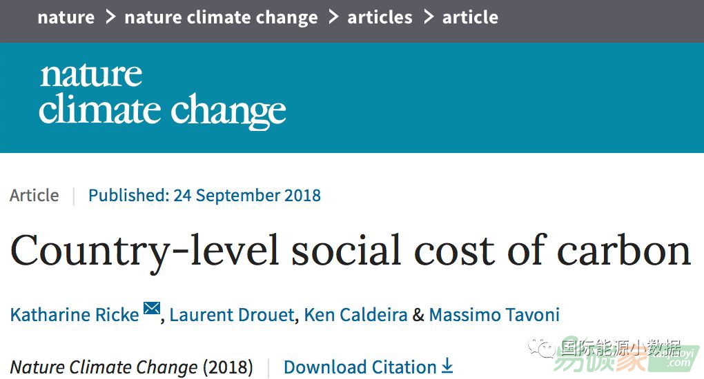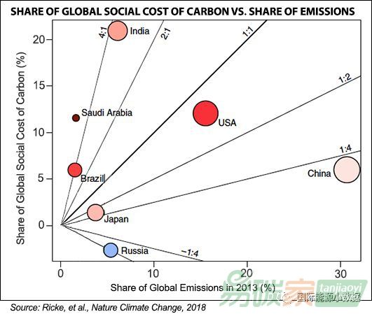 因溫室氣體排放所帶來(lái)的全球變暖將給世界帶來(lái)巨大的社會(huì)成本,但是不同的國(guó)家這一社會(huì)成本有所不同。根據(jù)美國(guó)和意大利學(xué)者在最新一期的《自然·氣候變化》雜志發(fā)表的研究(Country-level social cost of carbon),把氣候變化對(duì)所有國(guó)家的經(jīng)濟(jì)損失加起來(lái),全球的