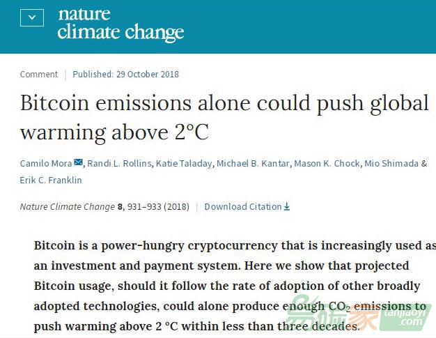 作為發(fā)展中國家的中國,發(fā)達(dá)國家長期利用碳排放量來攻擊我們,以此來遏制中國的發(fā)展腳步。不過最近學(xué)者又開始拿起這把利刃亂砍一通了,夏威夷大學(xué)副教授在著名科學(xué)網(wǎng)站自然上發(fā)布了一篇有關(guān)自然氣候變化的論文,它們稱如果比特幣在全球大規(guī)模采用后會對地球環(huán)境產(chǎn)生惡劣影響,可能會加速地球氣候的惡化。