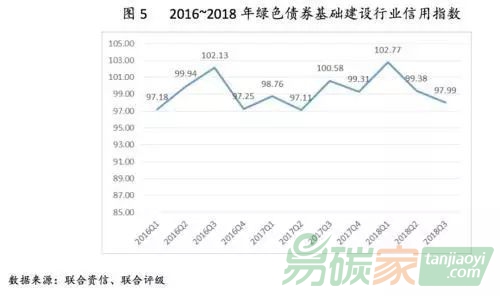 2016年一季度,基礎(chǔ)建設(shè)行業(yè)受到集中兌付壓力較大的影響,信用指數(shù)下降至97.18,比基期下降2.82個(gè)百分點(diǎn)。隨著兌付壓力緩釋?zhuān)袠I(yè)環(huán)境改善等因素影響,2016年二季度和三季度基礎(chǔ)建設(shè)行業(yè)信用指數(shù)開(kāi)始回升,分別達(dá)到99.94和102.13。2016年四季度,受市場(chǎng)表現(xiàn)不佳和整體宏觀資金面緊張影響,基礎(chǔ)建設(shè)行業(yè)信用指數(shù)大幅下跌4.78個(gè)百分點(diǎn),降至97.25。2017年一至四季度,基礎(chǔ)建設(shè)行業(yè)信用指數(shù)上下小幅調(diào)整,分別為98.76、97.11、100.58和99.31,但波動(dòng)幅度不大,整體保持相對(duì)穩(wěn)定。進(jìn)入2018年,基建行業(yè)綠債行情較好,發(fā)行優(yōu)勢(shì)明顯,主體和債項(xiàng)要素質(zhì)量表現(xiàn)明顯提升,行業(yè)綜合指數(shù)上升至102.77,成為拉動(dòng)綠色債券信用質(zhì)量上升的主要力量。但隨著市場(chǎng)信用事件爆發(fā),環(huán)保行業(yè)處于高壓環(huán)境,發(fā)行優(yōu)勢(shì)減弱,二季度基礎(chǔ)建設(shè)行業(yè)綠色債券整體信用指數(shù)出現(xiàn)下滑,綜合指數(shù)下降3.30個(gè)百分點(diǎn),達(dá)到99.38;三季度更是受此影響,持續(xù)下滑至97.99。
