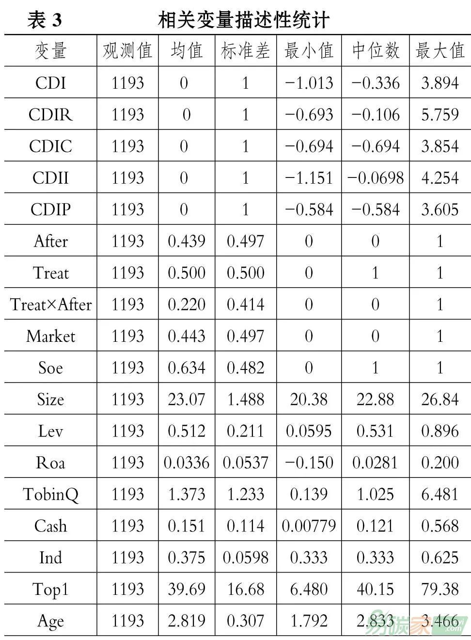 表3列示了本文相關(guān)變量的描述性統(tǒng)計(jì)結(jié)果。其中,對(duì)碳透明度變量進(jìn)行Z-Score標(biāo)準(zhǔn)化后,CDI的最小值為-1.013,最大值為3.894,說(shuō)明樣本企業(yè)之間存在明顯的差距,中位數(shù)為-0.336,均值為0,說(shuō)明樣本中有超過(guò)半數(shù)的企業(yè)進(jìn)行了較多碳透明度的披露。CDIR和CDIC的最小值分別為-0.693和-0.694,最大值分別為5.759和3.854,這說(shuō)明樣本企業(yè)在年報(bào)碳透明度中的差距大于社會(huì)責(zé)任報(bào)告碳透明度。另外,我們發(fā)現(xiàn)CDII和CDIP的最小值分別為-1.151和-0.584,最大值分別為4.254和3.605,說(shuō)明相對(duì)碳績(jī)效透明度而言,樣本企業(yè)在碳管理透明度中的差距較大。Treat和After的均值都接近0.5,這說(shuō)明整個(gè)數(shù)據(jù)結(jié)構(gòu)相對(duì)均衡。