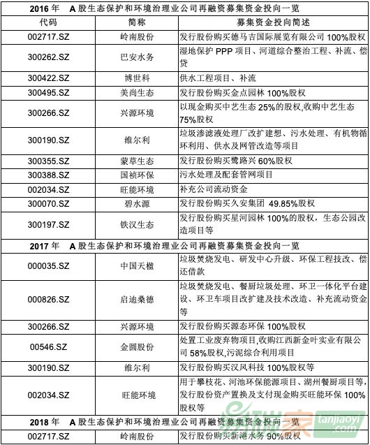 表4 2016-2018年A股生態(tài)保護和環(huán)境治理行業(yè)上市公司再融資募集資金投向情況