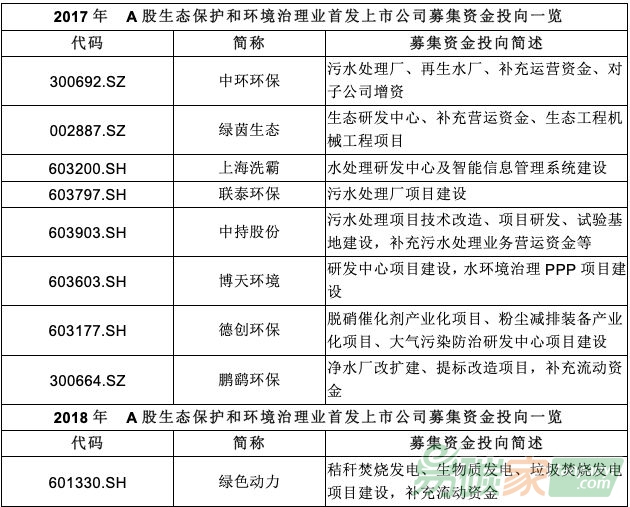 表2 2017-2018年A股生態(tài)保護和環(huán)境治理行業(yè)首發(fā)上市募集資金投向情況