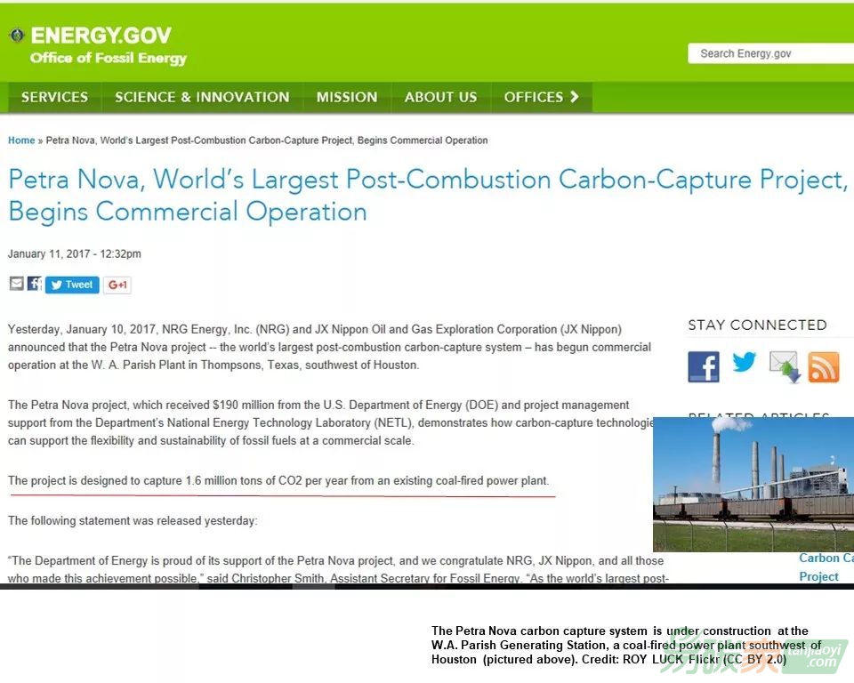 這是目前世界上最大的140萬噸/年燃煤電廠CO2捕集裝置(美國的Petra Nova)。140萬噸燃燒后捕集。