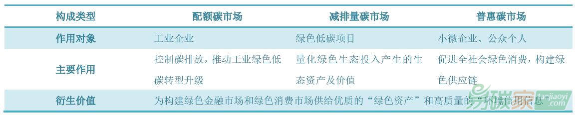 碳市場和普惠碳市場三者互相聯(lián)通、互為補充,形成了“三位一體”的多層次復合型碳市場格局。其中,配額碳市場通過