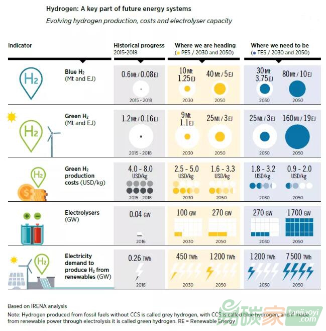 國際可再生能源署發(fā)布“全球可再生能源展望:能源轉(zhuǎn)型2050”報告,關(guān)于藍(lán)氫(化石能源制氫+碳捕捉和封存)、綠氫(可再生能源制氫)、綠氫成本的情境分析如下: