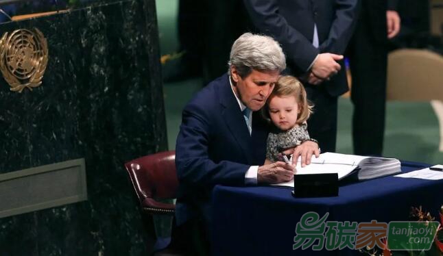2016年4月22日,美國國務卿克里抱著自己的孫女正式簽署了《巴黎協(xié)定》 (鳳凰網(wǎng))