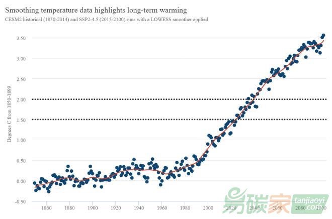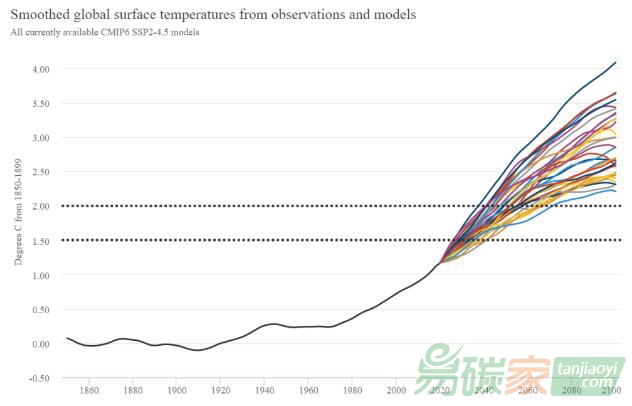 簡(jiǎn)單地在每個(gè)模型中使用自工業(yè)化前時(shí)期以來(lái)的變暖量來(lái)確定何時(shí)超過(guò)1.5℃和2℃的限值是非常具有誤導(dǎo)性的,因?yàn)橐恍┠P鸵锤吖懒耸澜缃?jīng)歷的實(shí)際變暖量,要么低估了它。因此,與其從十九世紀(jì)就開始使用模型預(yù)測(cè)數(shù)據(jù),不如利用從過(guò)去到現(xiàn)在的觀測(cè)溫度,然后再模擬不同氣候模型下,未來(lái)的溫升數(shù)值。下圖展示了這個(gè)方法,2020年前,使用了平滑平均觀測(cè)溫度記錄,之后使用在不同情景下不同的CMIP6氣候模型模擬數(shù)據(jù)。