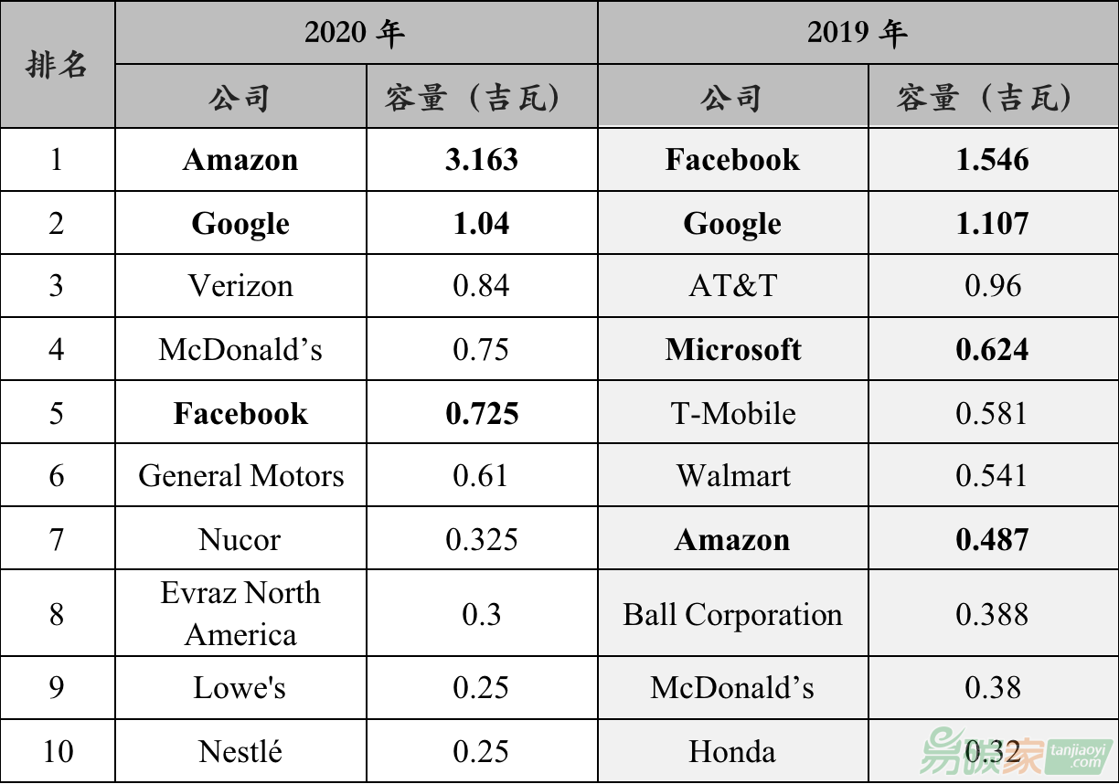互聯(lián)網(wǎng)公司是最大的可再生能源采購商。 根據(jù)REBA( 可再生能源購買者聯(lián)盟 )數(shù)據(jù),2020年美國十大可再生能源采購商中,有亞馬遜、Google和Facebook三家互聯(lián)網(wǎng)公司入圍,分居第一、第二和第五位。 三家公司共采購4.928吉瓦可再生能源,占全美總采購額的46.5%。 2019年有Facebook、Google、微軟和亞馬遜4家互聯(lián)網(wǎng)公司入圍前十名。 四家公司共采購3.764吉瓦可再生能源,占全美總采購額的40%。 值得注意的是,全美可再生能源采購商的前二位連續(xù)兩年都是互聯(lián)網(wǎng)公司。 如下表所示。