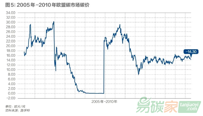 碳交易起始價(jià)較高,2005年初從15歐元/噸價(jià)位迅速上漲到28歐元/噸。但在2006年4月底,由于核查排放數(shù)據(jù)泄露,并顯示發(fā)放給成員國(guó)的