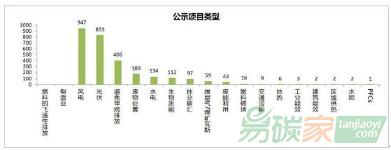 就公示項(xiàng)目類型而言,以可再生能源居多,共計(jì)2032個(gè),占公示項(xiàng)目總數(shù)的71%,其中:風(fēng)電947個(gè)、光伏833個(gè)、水電134個(gè)、生物質(zhì)能112個(gè)、地?zé)?個(gè)。其次是避免甲烷排放類項(xiàng)目,共計(jì)406個(gè),占公示項(xiàng)目總數(shù)的14%;再次是廢物處置類項(xiàng)目,共計(jì)180個(gè),占公示項(xiàng)目總數(shù)的6%。