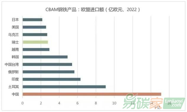 臺(tái)灣、韓國(guó)、越南、瑞士、烏克蘭、美國(guó)和日本。在上述11個(gè)國(guó)家和地區(qū)中,瑞士因豁免于CBAM應(yīng)予排除,剩下的就是歐盟進(jìn)口 “CBAM鋼鐵產(chǎn)品”的十大來(lái)源。中國(guó)排名第一,為151億歐元,占?xì)W盟從中國(guó)進(jìn)口總額的2.4%。