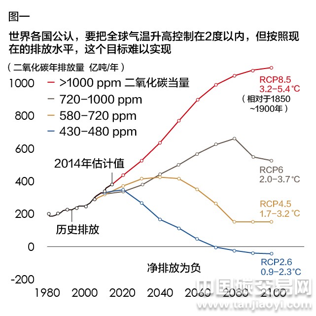 上圖中,黑色的線代表過去30年和目前的全球碳排放量的水平。彩色的線代表不同的碳排放量給未來全球平均溫度帶來變化的幾個(gè)趨勢。