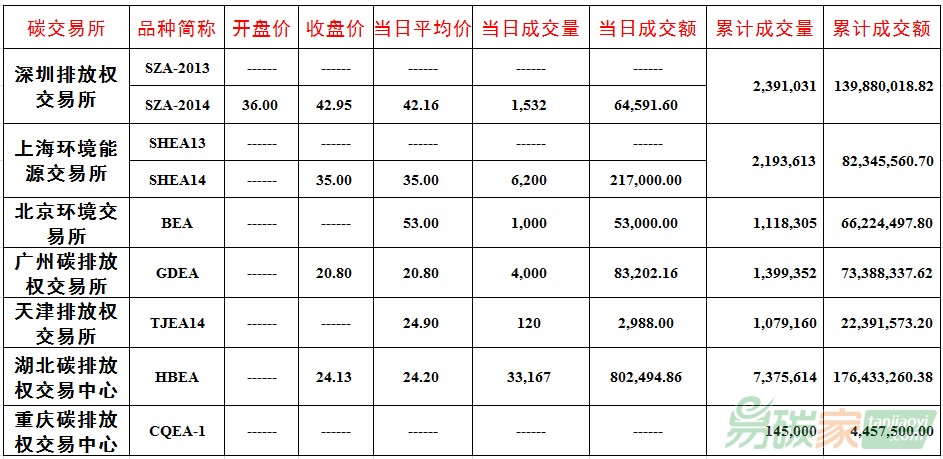 品種SZA-2014成交1,532噸,成交額64,591.60元,開盤價(jià)36.00元,最高價(jià)43.40元,最低價(jià)36.00元,收盤價(jià)42.95元,較前一交易日上漲7.38%。截止當(dāng)日,深圳碳