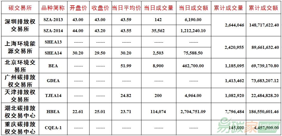 品種SZA-2013成交142噸,成交額6,190.00元,開盤價(jià)43.00元,最高價(jià)45.00元,最低價(jià)43.00元,收盤價(jià)43.00元,較前一交易日下跌4.44%。品種SZA-2014成交35,562噸,成交額1,212,240.10元,開盤價(jià)44.00元,最高價(jià)44.00元,最低價(jià)40.00元,收盤價(jià)43.20元,較前一交易日下跌1.59%。截止當(dāng)日,深圳碳