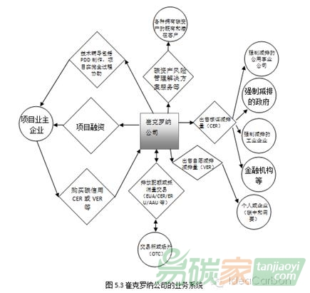 第一部分中的具體業(yè)務(wù)行為包括向項(xiàng)目業(yè)主提供全面的技術(shù)指導(dǎo)和服務(wù)、協(xié)助項(xiàng)目業(yè)主制作項(xiàng)目說(shuō)明書(shū)(PDD)、項(xiàng)目實(shí)施的技術(shù)選擇、項(xiàng)目申請(qǐng)注冊(cè)等等;向項(xiàng)目業(yè)主提供融資;提供各種靈活的合同條款購(gòu)買(mǎi)項(xiàng)目業(yè)主未來(lái)的碳信用。第二部分的具體業(yè)務(wù)行為包括向具有強(qiáng)制減排目標(biāo)的公用事業(yè)公司、政府、工業(yè)企業(yè)以及相關(guān)金融機(jī)構(gòu)出售碳信用。這些碳信用包括崔克羅納公司自己購(gòu)得的核證減排量(CER),也包括客戶所需要的其他配額產(chǎn)品(如EUAs)。公司也向有碳中和需要的企業(yè)和個(gè)人出售自愿減排產(chǎn)品(VER)。第三部分的具體業(yè)務(wù)行為包括通過(guò)各主流的交易所平臺(tái)和場(chǎng)外交易平臺(tái),交易各種碳產(chǎn)品;同時(shí)向擁有碳資產(chǎn)的各類(lèi)企業(yè)提供碳資產(chǎn)風(fēng)險(xiǎn)管理咨詢服務(wù)(見(jiàn)圖5.3)。