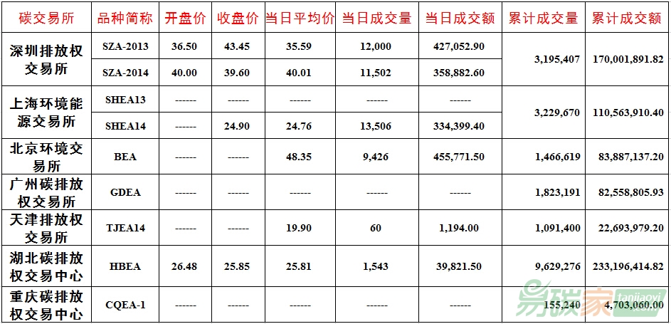 品種SZA-2013成交12,000噸,成交額427,052.90元,開盤價36.50元,最高價43.45元,最低價35.55元,收盤價43.45元,較前一交易日上漲10.00%。品種SZA-2014成交11,502噸,成交額358,882.60元,開盤價40.00元,最高價43.00元,最低價39.60元,收盤價39.60元,較前一交易日下跌10.00%。截止當日,深圳碳